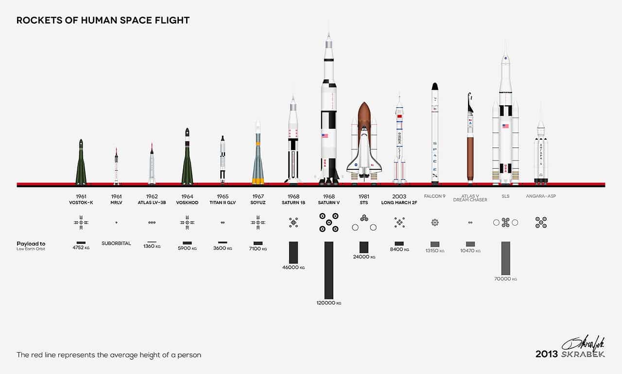 Great infographic showing the different rockets that have made (and will continue to make) human spaceflight possible. Developed by Tyler Skrabek of www.skrabek.com.